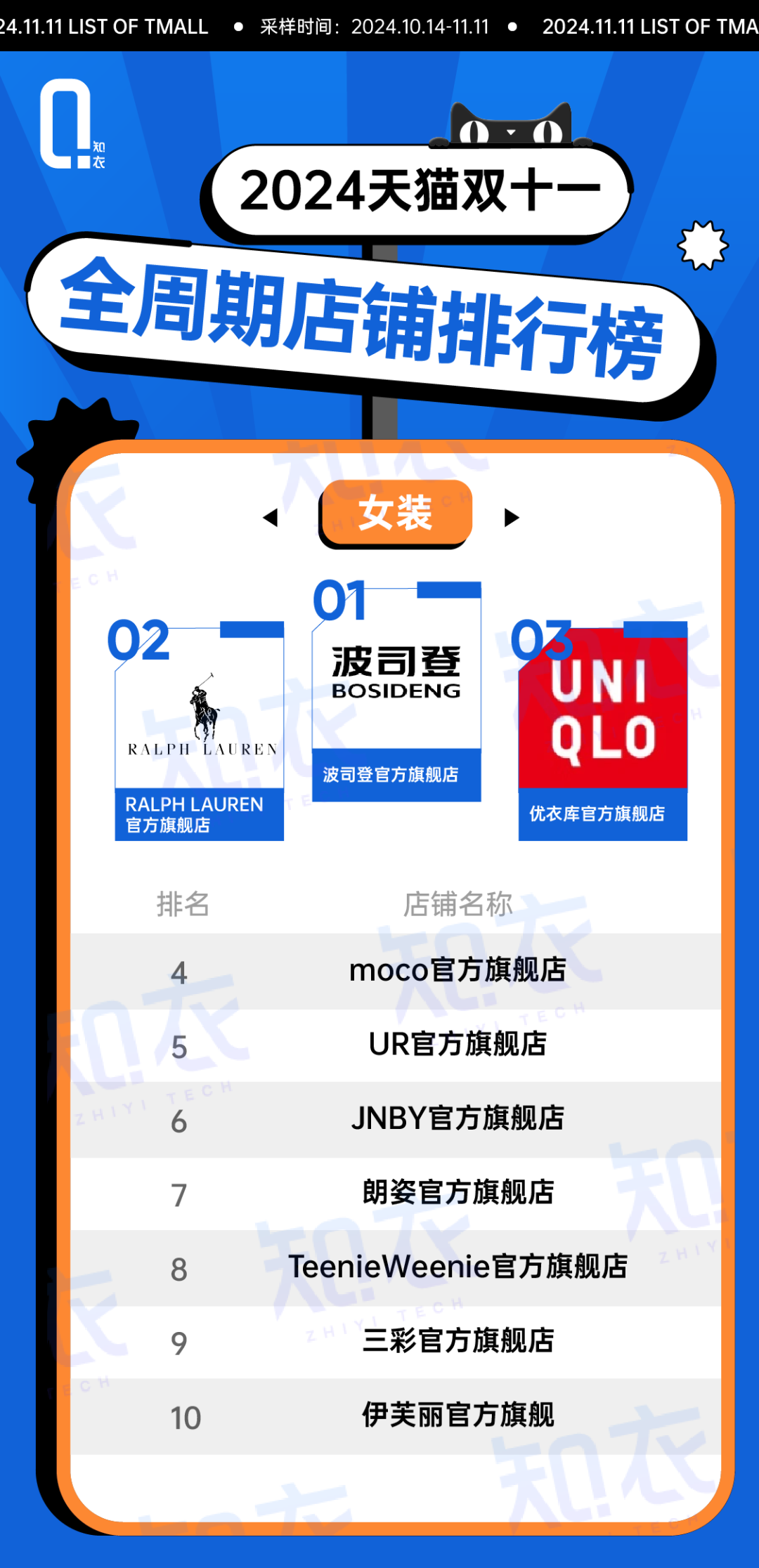 1.「波司登官方旗舰」、「RALPH LAUREN官方旗舰店」与「优衣库官方旗舰店」拿下24天猫双11全周期女装店铺的前三;