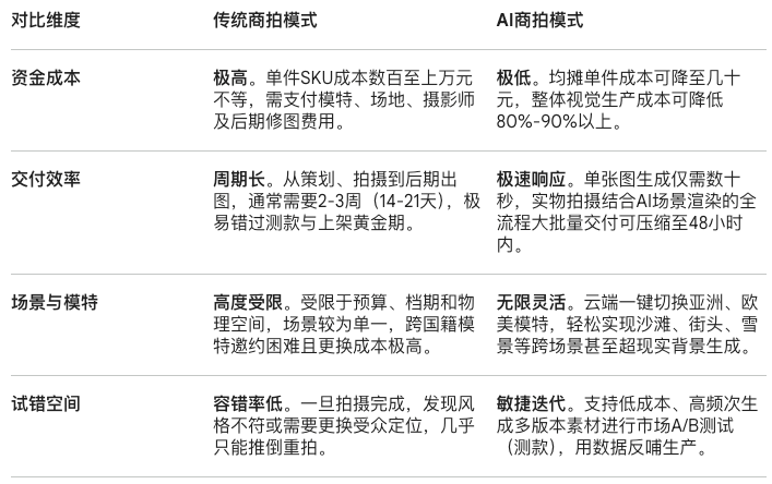 电商行业的本质在于“效率”与“利润”的平衡。通过下方的核心维度对比,我们可以直观地看到AI商拍工具相较于传统商拍所带来的颠覆性优势: