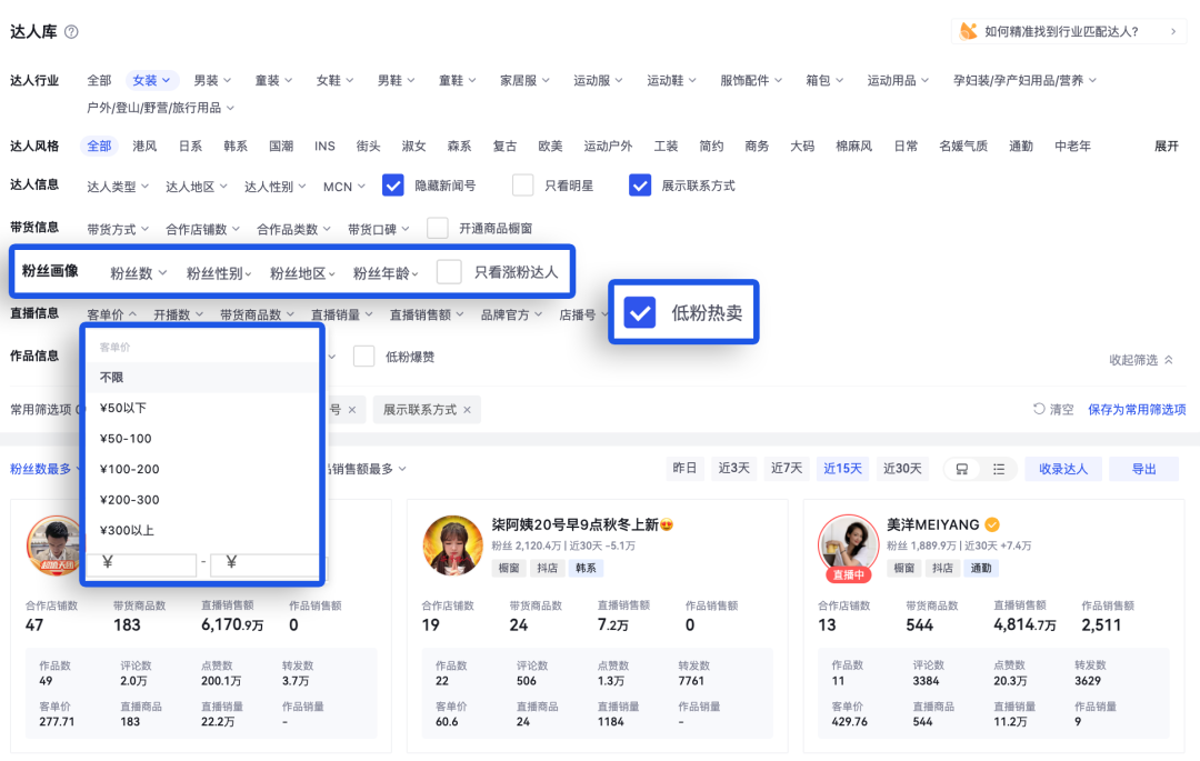 达人的性价比问题,则支持通过【低粉热卖】选项筛选出粉丝量低于10W,但月直播超过500W的优质带货达人,以及一系列时间与销售效果相关的排序条件,例如近3天发布视频最多的达人、近15天直播销售额最多的达人,进一步挖掘到直播效果最好的性价比达人。