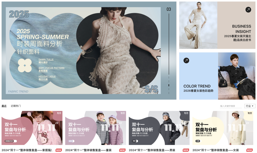 系统化的总结,则有「知款」出品一系列趋势报告,由知衣专业的趋势团队每月持续输出,累计至今共有数百份,既包括各季度的流行趋势盘点,如《2025/26秋冬女装色彩趋势》,也涵盖了数据向的市场趋势分析,如《2024双十一整体销售复盘——女装》,为各大服装品牌提供趋势参考。