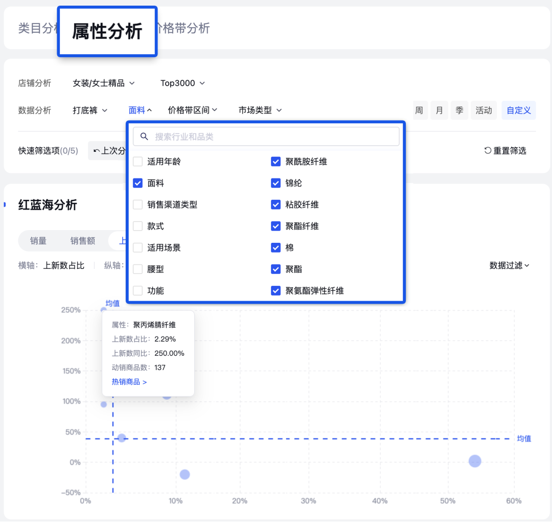 如上图,我们结合X轴、Y轴与气泡的数值,可知在24年10月天猫女装防晒服中聚丙烯腈纤维面料变现出高增长低占比的潜力趋势,上新数占比为2.29%,同比却达到了250%。