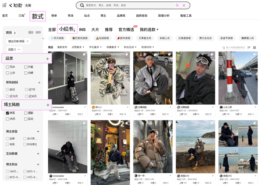 解决方案:跟前面的小伙伴一样,我也是在【知款】的【款式库】里找,但我的目标平台是INS,锁定的博主地区是韩国。