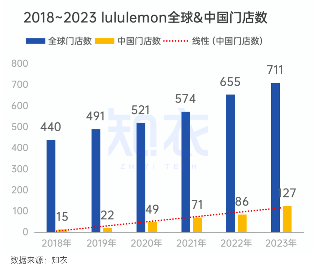 与高增长对应的是,2023年lululemon全球新增的56家门店中,中国占28家,而进入2024年后,中国门店数的增速更迅猛了(如下图)。