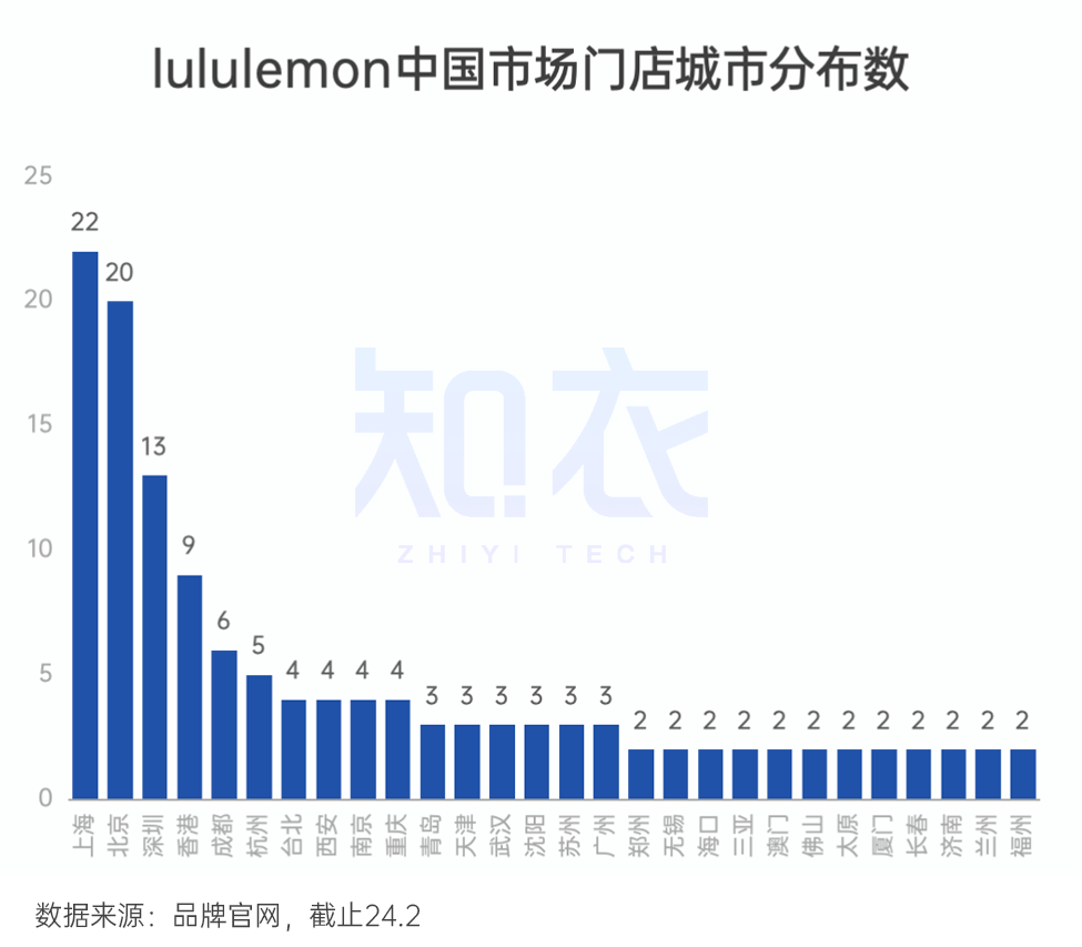 Calvin McDonald透露,将继续在中国一线至三线城市寻找机会。截至目前,lululemon在中国共有148家门店,主要分布在全国43个城市,一线城市的门店数量最多,“新一线”城市次之 ,二三线门店占比已经超过20%。
