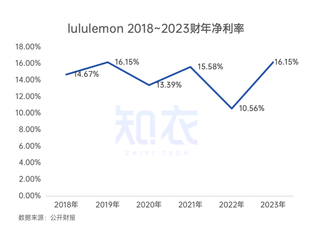 另一方面,结合财年净利率,我们注意到lululemon2018年以来的净利率基本在15%左右浮动,表现如下图: